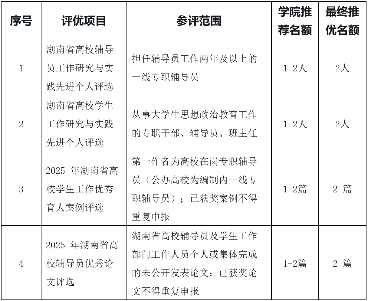 根据湖南省高校思想政治教育研究会辅导员工作专业委员会、学生工作专业委员会《关于评选2025年湖南省高校辅导员、学生工作先进单位、个人、论文、案例的通知》(专委会〔2026〕1号、2号、3号)精神,为深入学习贯彻习近平新时代中国特色社会主义思想和党的二十大及二十届历次全会精神,学生工作处决定组织开展2025年度湖南省高校辅导员及学生工作系列评优校内遴选推荐工作。现将有关事项通知如下: